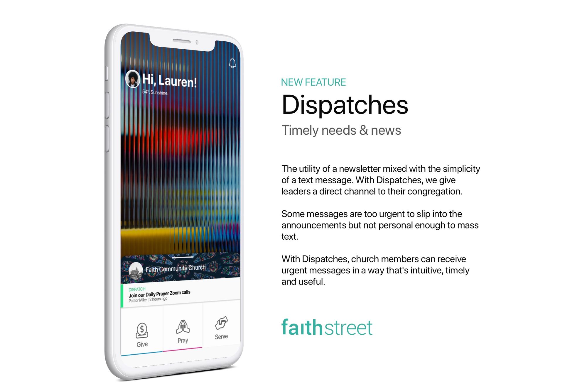 Today, we're releasing a new way to share timely needs and news through FaithStreet: Dispatches. Think of it like something between a text message and a newsletter: the utility of a newsletter mixed with the simplicity of a text message. Voila!