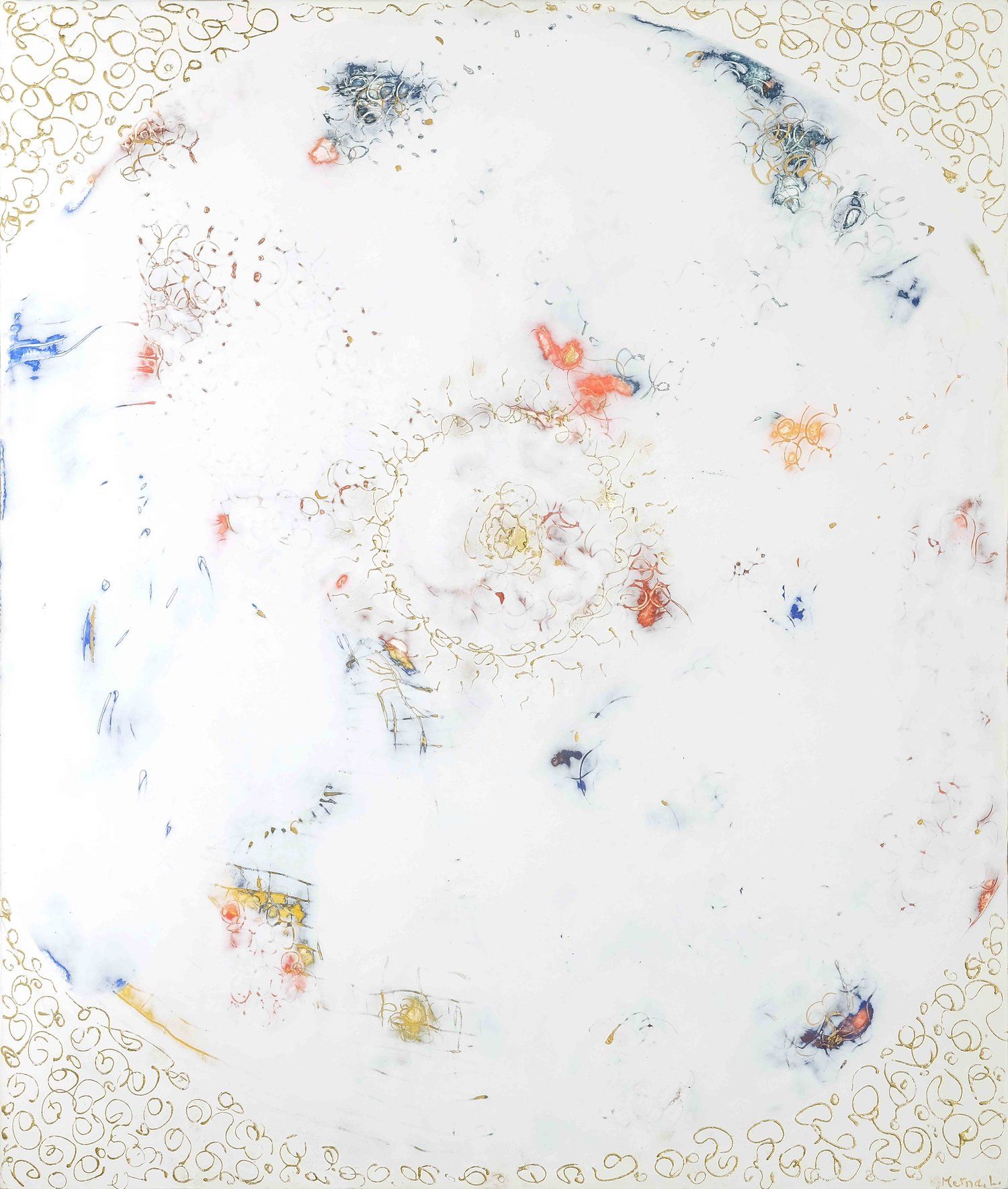 Part of the Heaven & Earth series has a circle as a theme symbolizing eternity. This painting has delicate colorful marks coming through the white veil that has been sanded down randomly to reveal the egg tempera colors underneath. The calligraphic marks seen in certain areas then slightly obscured underneath the transparent gesso. It's as if seeing through a veil to what is hidden. It's a play between the visible and the invisible. The 23.5 ct gold marks catch the light and give a sense of illumination. It's a painting that reveals new things every time you look at it.