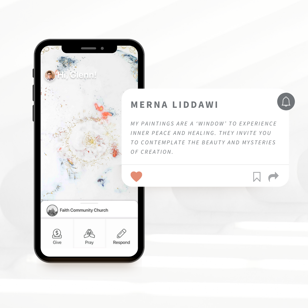 Her opening artwork, currently featured on FaithStreet's congregation app home screen, is a painting from Merna's Heaven & Earth Series - Heaven & Earth III.