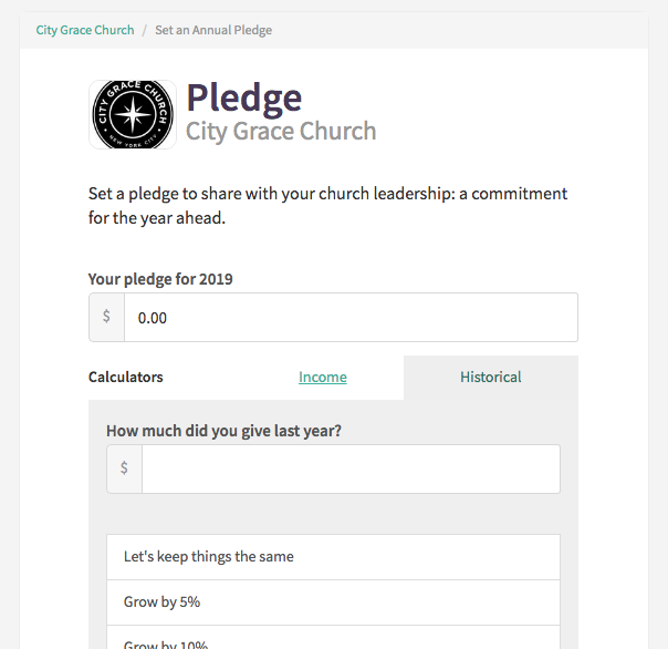 Real Commitment: Pledges are created as shared commitments to annual giving. We treat them a bit differently than goals. Goals are personal. When setting a giving Goal, a giver can choose to share that amount with you or keep the total amount hidden. Pledges are always shared with FaithStreet admins.