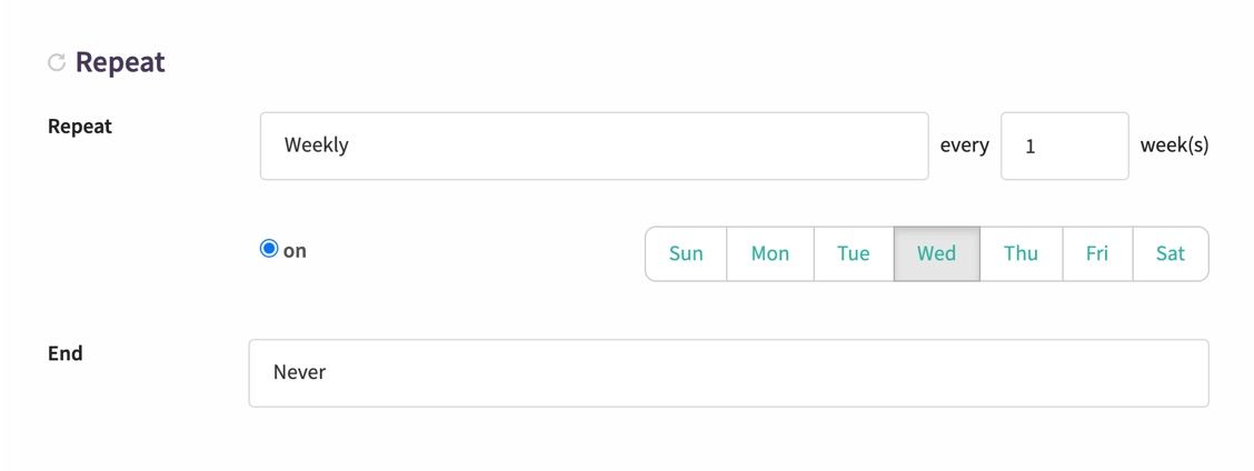 Create events that repeat on a weekly, monthly or annual schedule. Up until now, keeping events up to date has been a time consuming activity. If you started out strong but have struggled to keep your events up to date, this is for you! We're so glad to be able to make one weekly task a bit easier for many. Thanks everyone for your patience and feedback as we brought this new set of features together.