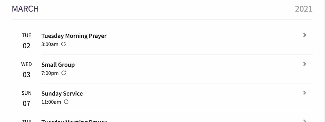 The most exciting benefit of recurring events is perhaps not the events themselves but the time you save by making use of them. For many churches, the same handful of events occur every week, others once or twice a month, a few annual events, and then one-time events sprinkled in. With recurring events, you only need to add an event once and set the schedule.